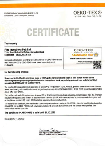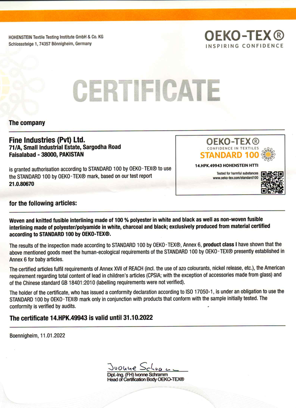 ISO 9001:2015 from SGS, GRS, UKAS 0005 (U.K) Oeko-Tex 14HPK-49943 Hohenstein (Germany)